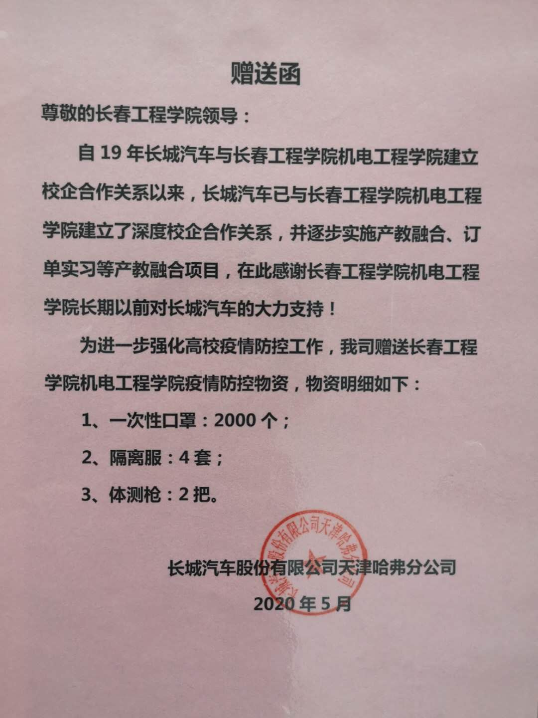 长城汽车股份有限公司是我院重点校企合作单位,在毕业生就业、学生实习实践、科研、人才培养等方面有着紧密合作。此次捐赠体现了长城汽车强烈的社会责任感和对学院的情怀,进一步增强了我院抗击疫情的信心和力量,众志成城,打赢疫情防控阻击战。