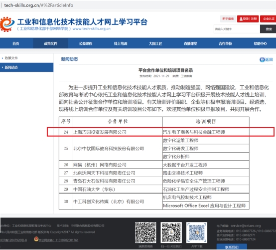 为深入推动制造强国、网络强国、人才强国建设,积极贯彻落实“国家发展改革委、人力资源社会保障部、工业和信息化部、全国总工会开展的支持鼓励劳动者参与线上职业技能培训活动”的重要指示精神(发改办就业〔2020〕100号),在工业和信息化部教育与考试中心指导下,上海巧园投资发展有限公司联合长春工程学院、上海工程技术大学、河南工学院、江苏大学、内蒙古大学、重庆交通大学等教育部高等教育司产学合作协同育人聊车城项目建设高校成立“教育教学指导委员会”,以《汽车电子商务与科技金融职业技能等级标准》为指导规范,在机械工业出版社·新工科·普通高等教育汽车类规划教材《汽车电子商务与金融》、《二手车鉴定评估与交易》基础上建设的“汽车电子商务与科技金融工程师”人才培养工程项目,被遴选为“工业和信息化线上培养工程”的线上培训项目,同时收录在《平台合作单位和培训项目名录》中,于2021年11月29日正式发布在工业和信息化技术技能人才网上学习平台。