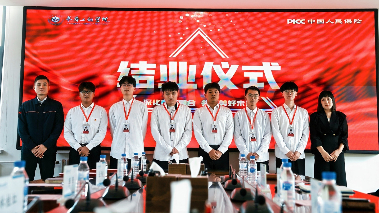 人保财险长春市分公司杜希超主任与林桂红经理共同为订单班学员发放实习工牌。