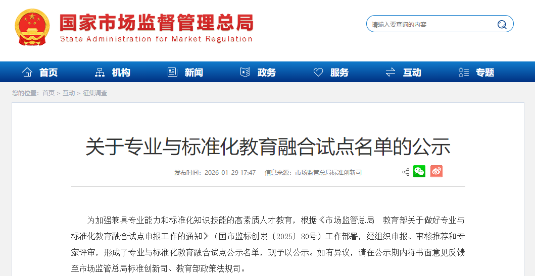 近日,市场监管总局标准创新司与教育部政策法规司联合发布《关于专业与标准化教育融合试点名单的公示》,我院与长春市标准研究院等单位联合申报的“智能车辆工程”专业成功入选全国专业与标准化教育融合试点。