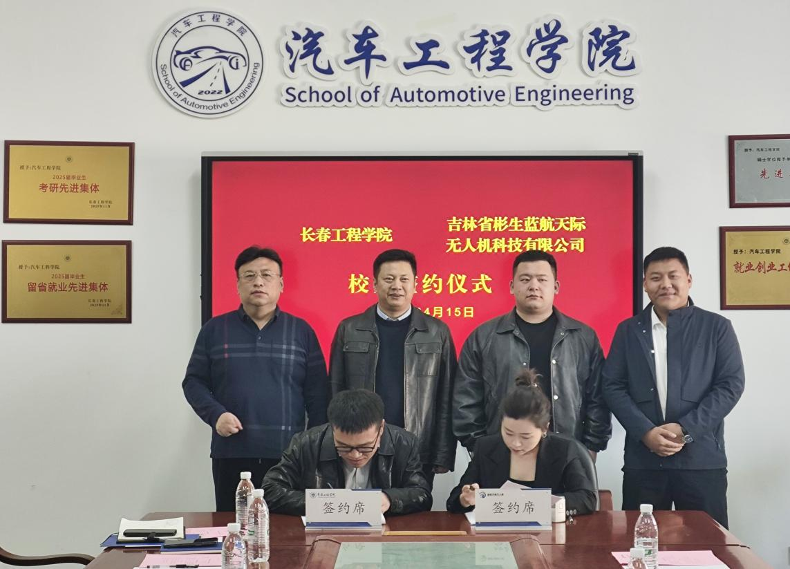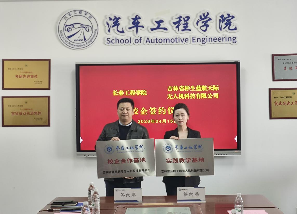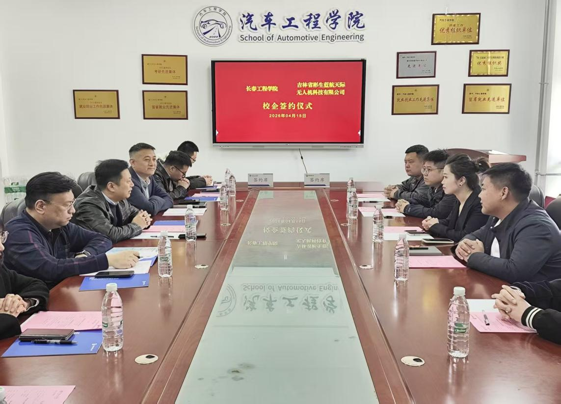 2026年4月15日,学校与蓝航天际无人机校企合作签约仪式在我校顺利举行。蓝航天际无人机董事长助理林园、项目部部长种法欣、项目经理孙宇与张猛、精英教员刘金鑫一行企业代表来访。学校校友联络及社会合作处副处长李中帅,未来技术学院常务副院长纪秀、副院长于宏辰,汽车工程学院班子成员参加仪式。仪式由汽车工程学院院长徐学东主持。