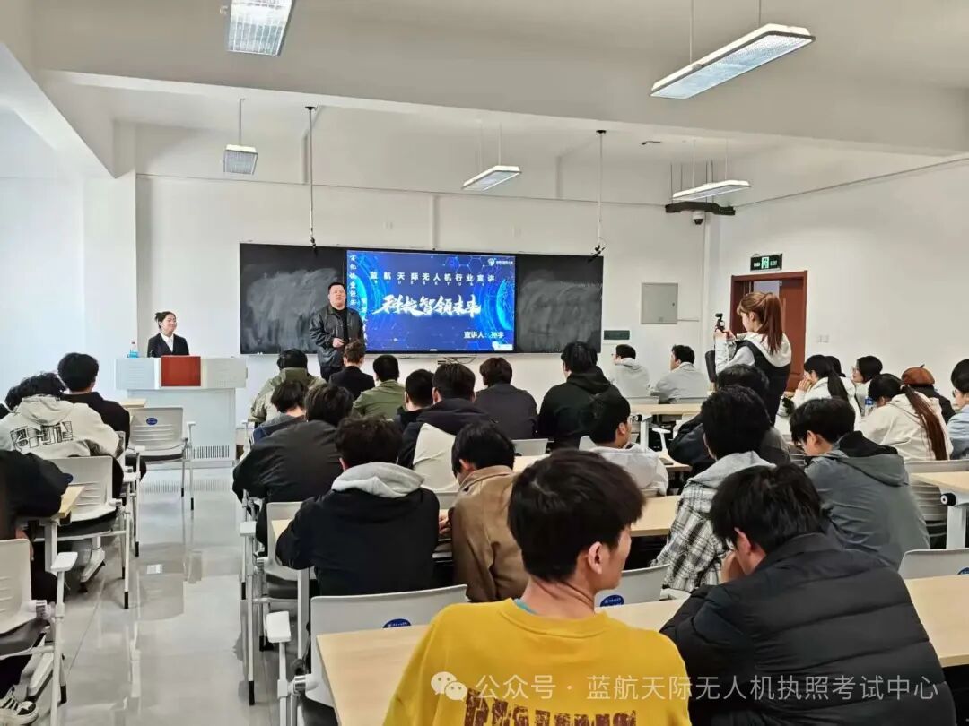 飞行表演结束后,蓝航天际无人机项目经理孙宇开展无人机专题宣讲。宣讲围绕无人机技术发展趋势、多领域行业应用场景、岗位核心技能标准及校企协同人才培养方案等内容,为师生带来内容详实、干货满满的专题分享。宣讲结合当前低空经济政策落地实施背景,系统解读了无人机产业高速发展态势与行业人才紧缺现状,结合电力巡检、农林植保、航拍测绘、应急救援等实际应用案例,全方位普及产业发展现状、就业方向与职业发展前景。
